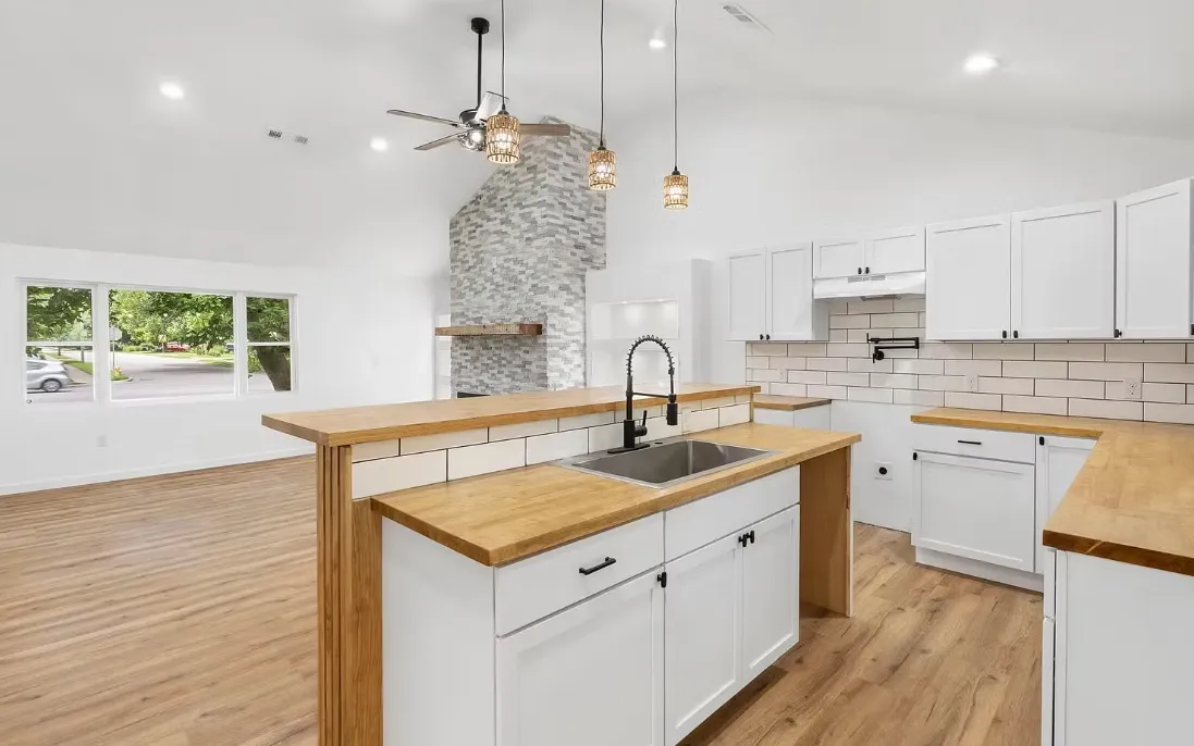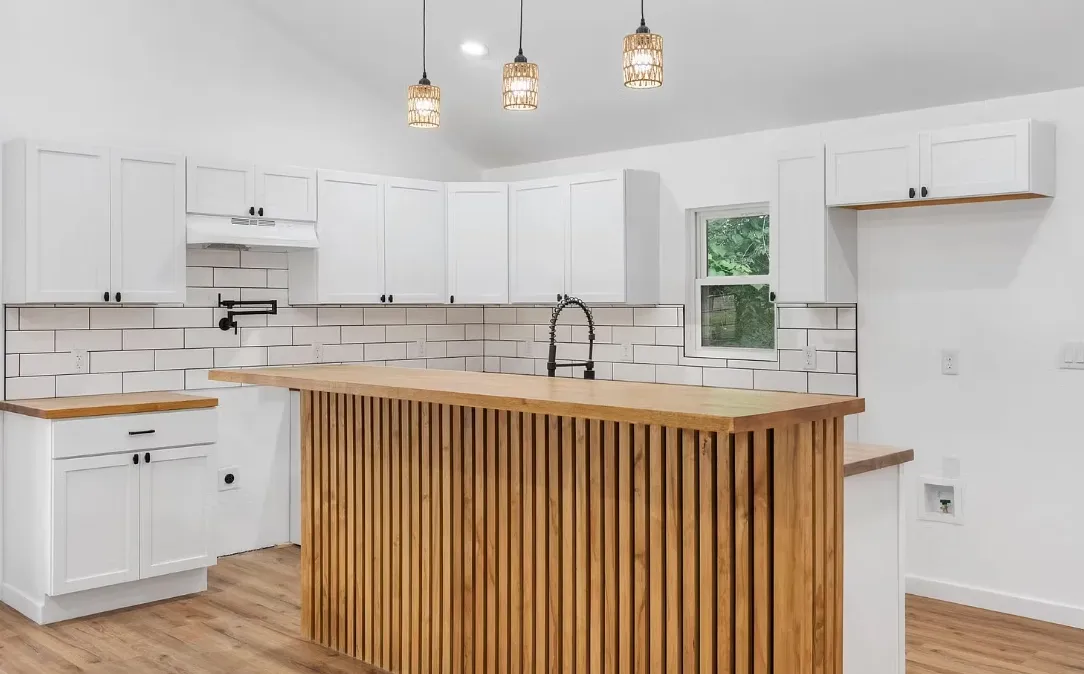 Modern kitchen with butcher block counters, shaker cabinetry, and tile backsplash