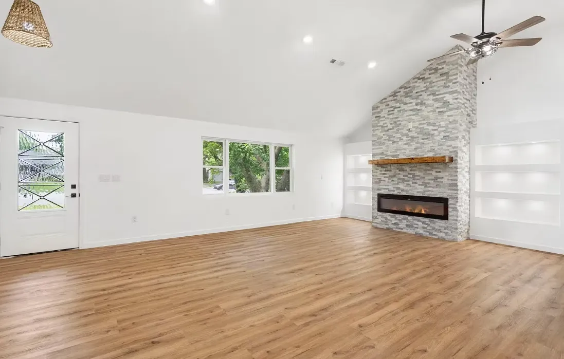Floor-to-ceiling stone fireplace accented with built-in lighting